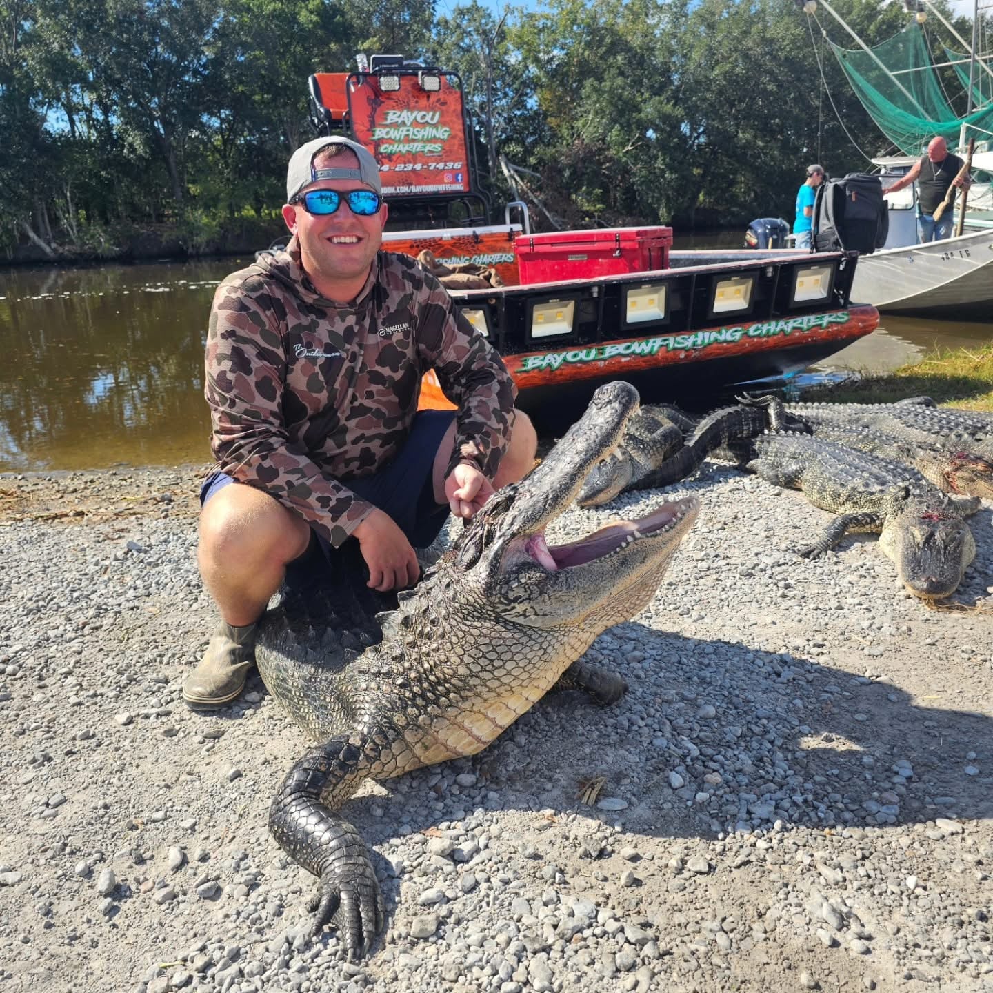 Hunt Louisiana alligators during the annual September season in the same marshes and bayous that have sustained Cajun tradition for generations. Bayou Bowfishing's licensed guides lead you through the maze of channels, bays, and backwater lakes of South Louisiana on an action-packed, hands-on gator hunt. The guides handle the lines, hooks, and boat positioning while you get to experience the raw thrill of wrangling gators out of the murky Louisiana marsh. This is not a canned hunt — every trip is a real, working hunt using traditional rod-and-reel and bang-stick methods passed down through generations of Louisiana hunters. The season is limited and fills up fast. Pricing varies based on group size and tag availability — call for a custom quote. All necessary permits and equipment are provided.